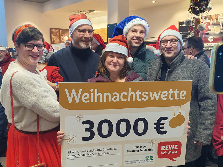 Die Immanuel Beratung Zehdenick hat die Weihnachtswette haushoch gewonnen. Gefordert waren 250 weihnachtlich verkleidete Menschen – gekommen sind deutlich mehr. Bei 368 wurde aufgehört zu zählen: ein neuer Rekord!